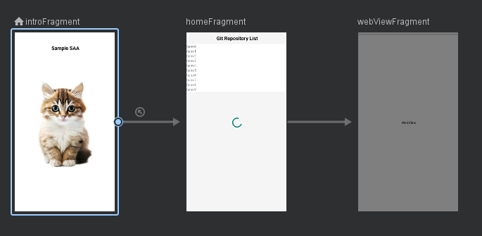 작성 코드는 IntroFramgnet -> HomeFragment -> WebViewFragment로 작성한 예시이고,